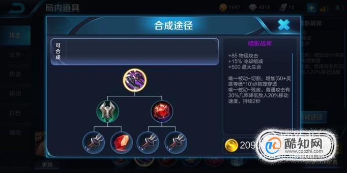 第二件装备小编推荐暗影战斧,它的属性是+85物理攻击,+15%冷却缩减,+500最大生命,被动一是切割,增加(50+英雄等级*10)点物理穿透,被动二是残废,普通攻击有30几率降低敌人20%移动速度,持续两秒。