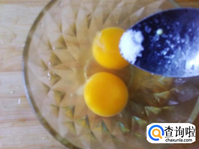 打2个鸡蛋到碗里,加适量的盐搅拌均匀。