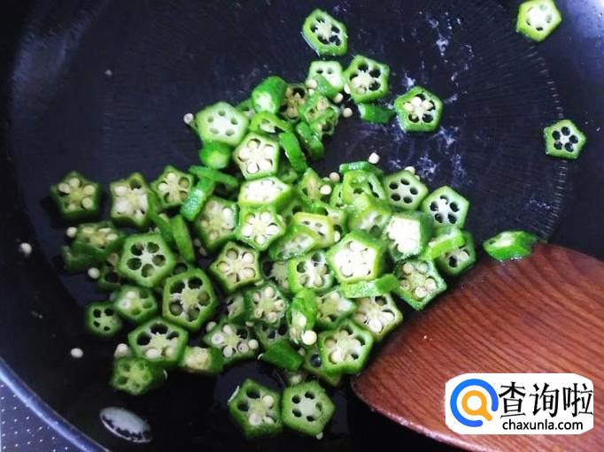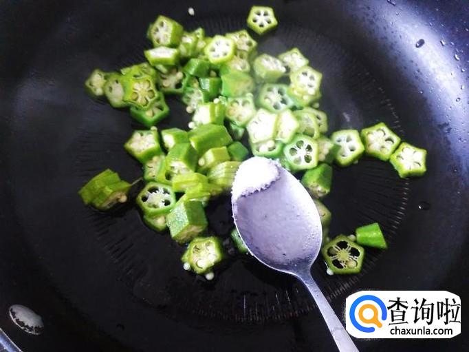 热锅下油,放秋葵下去,加适量的盐翻炒1分钟,熄火。