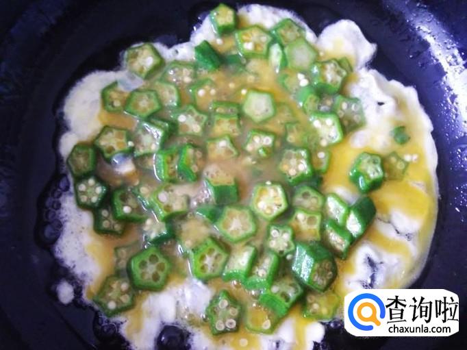 然后铲炒好的秋葵和鸡蛋混合,再搅拌均匀。