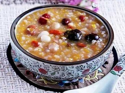 先将莲子去衣去心放入碗中加水浸没,再放入蒸笼,用旺火蒸约1小时,蒸熟取出备用。将桂圆去掉皮、核,只要肉;将栗子剥掉壳及衣。锅内放入适量的水,然后把秫米、红小豆、花生米、小红枣洗干净倒入锅内煮,待煮成半熟时,再将大米、黄小米、粘黄米、糯米洗干净倒入锅内一起煮,待锅开后,再用微火煮。将粥煮熬到七八成熟时,把蒸熟的莲子倒入粥内搅拌均匀,开锅后再煮一会移下火来,盛入清洁消毒的锅内,撒上白糖即可。