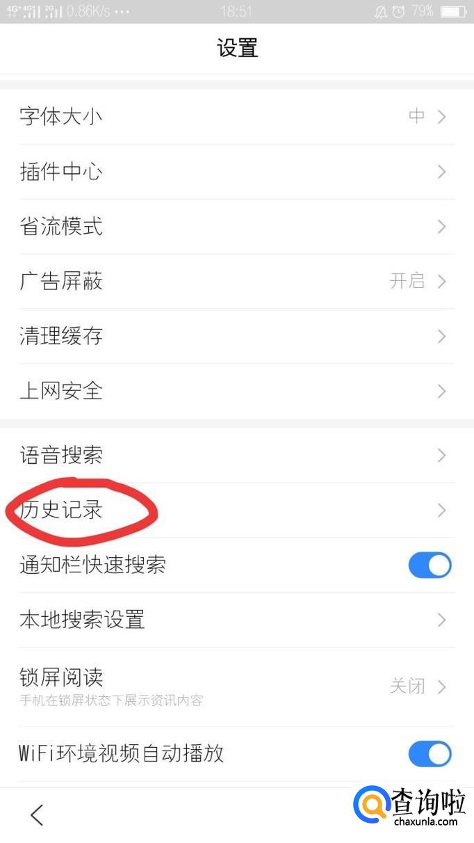 在设置页面中,找到“历史记录”选项,点击进入下一个操作页面。