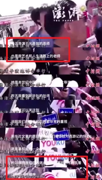 还不仅如此,在参加追悼会的路上,咱们章老师被媒体采访,也是这个套路:杨洁导演非常棒,我们要继承这种对艺术的执着精神。