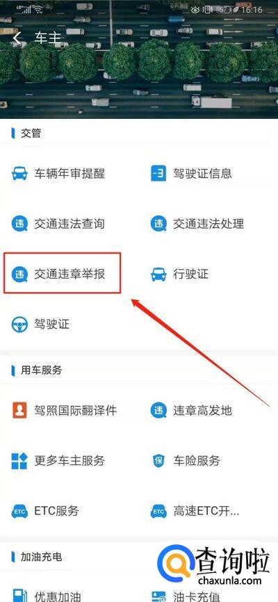这时我们可以在上方的“交管”栏中看到“交通违章举报”,点击进入。