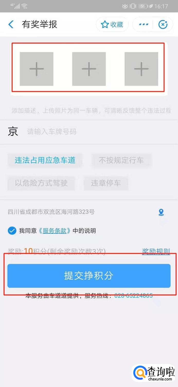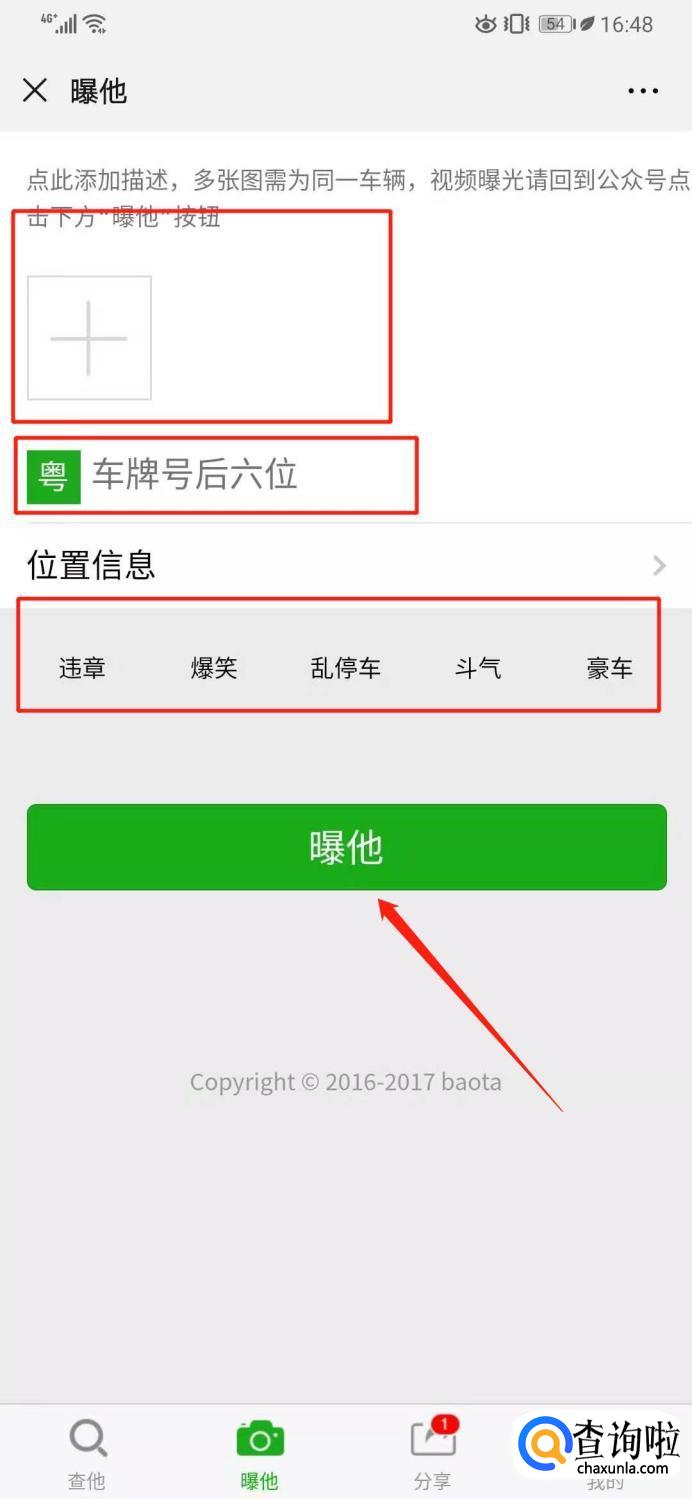 从上到下依次是添加图片、车牌号码、规章位置、曝光类型、上传资料。