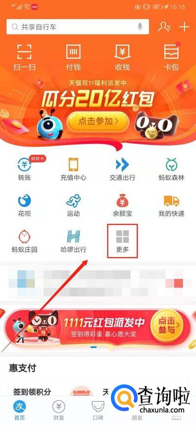 然后进入支付宝界面里,看到右侧有一个“更多”的选项,点击进入。