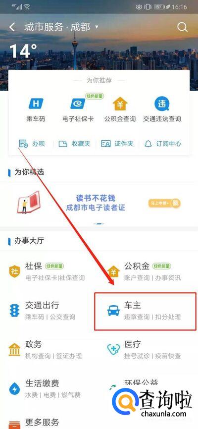 进入城市服务界面中后,我们在右下方看到“车主”选项,点击进入。