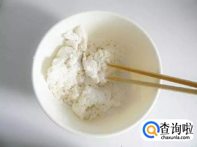 将面粉、糯米粉,加入泡打粉,还有小苏打搅拌好,用温水搅拌成絮状。