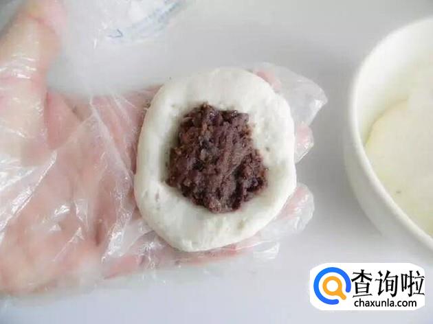 放入好吃的豆沙馅,像包包子一样,进行收口。