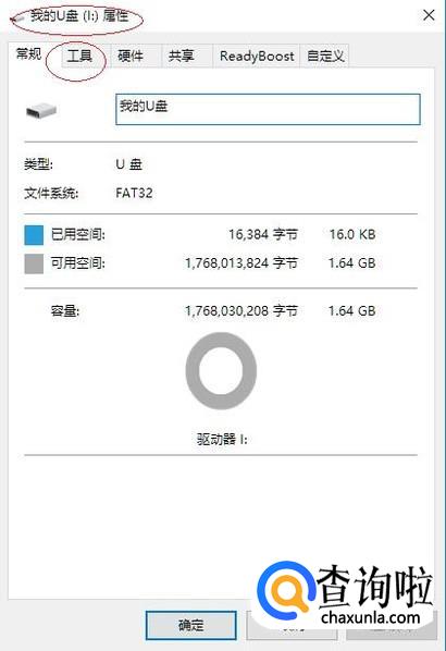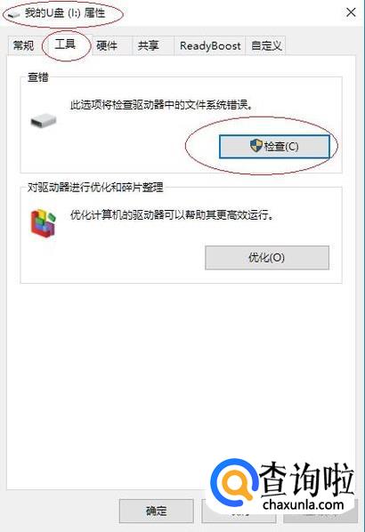 弹出"我的U盘 属性"对话框,如图所示。选择"工具"标签,下步将进行电脑插入U盘提示需要格式化故障排除的操作。