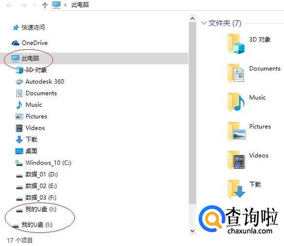 唤出"资源管理器"程序窗口,如图所示。展开左侧树形目录结构,选中"我的U盘"图标。