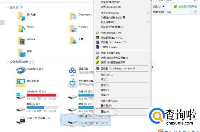 如图所示,鼠标右击"我的U盘"图标。弹出快捷菜单,选择"属性"项。
