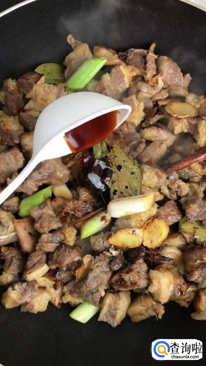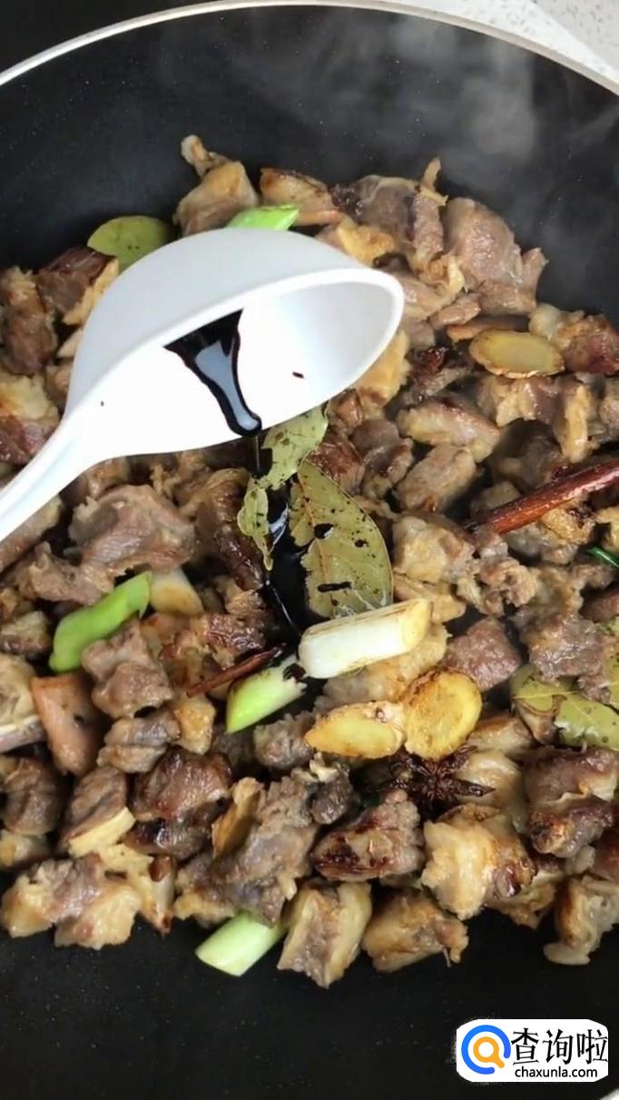 然后往锅中加入生姜、蒜、酱油、蚝油,翻炒三分钟,如下图所示。