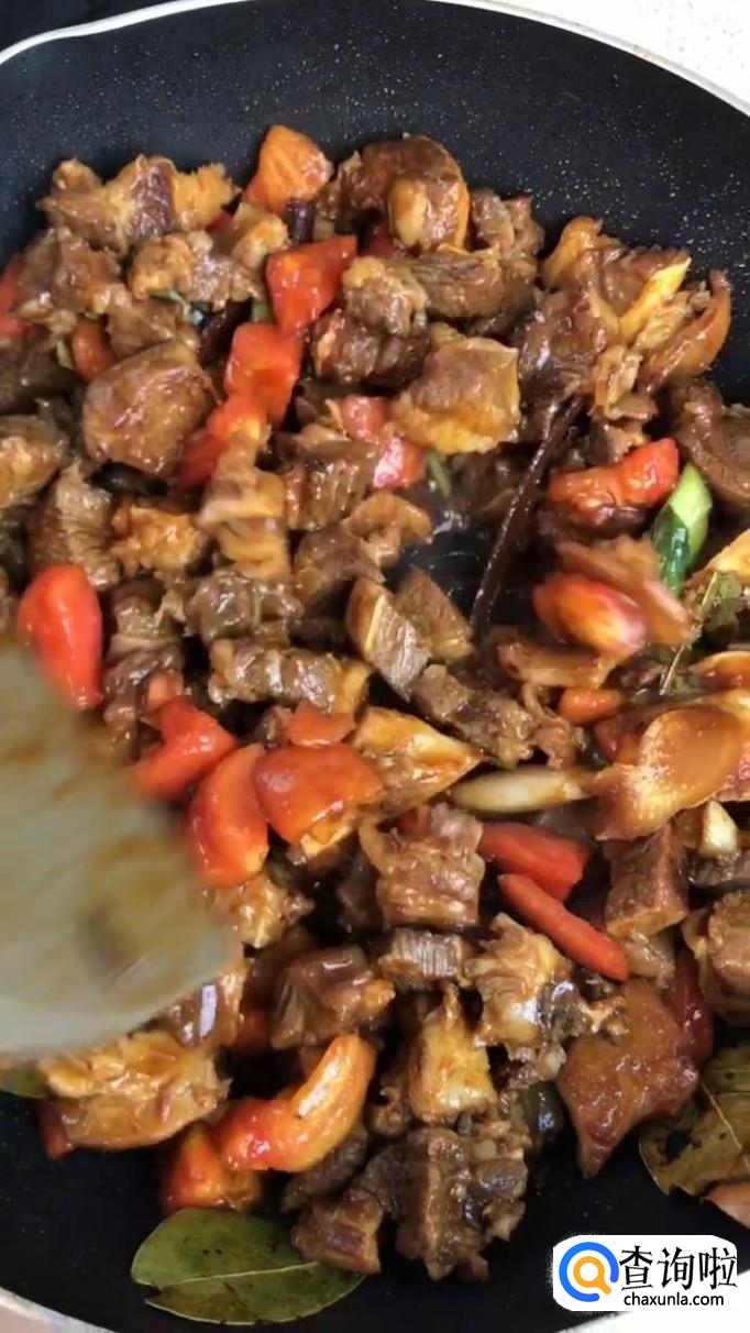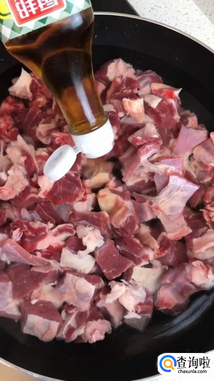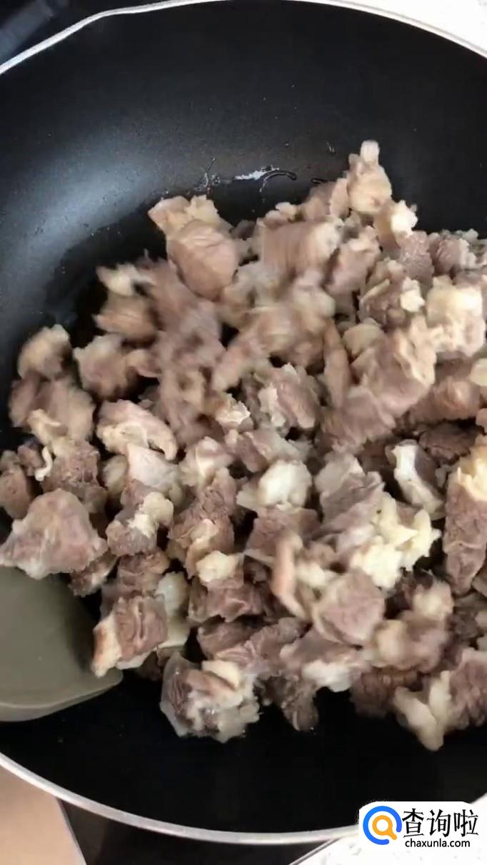 接着把牛肉倒入锅中翻炒两分钟,如下图所示。
