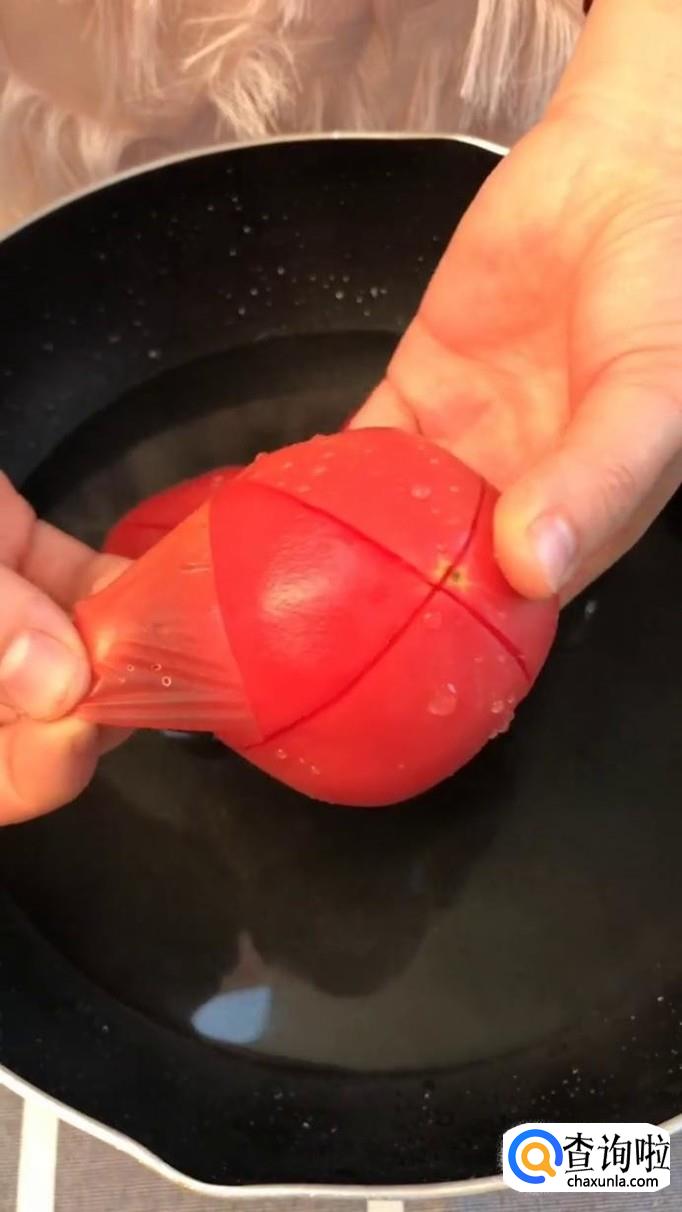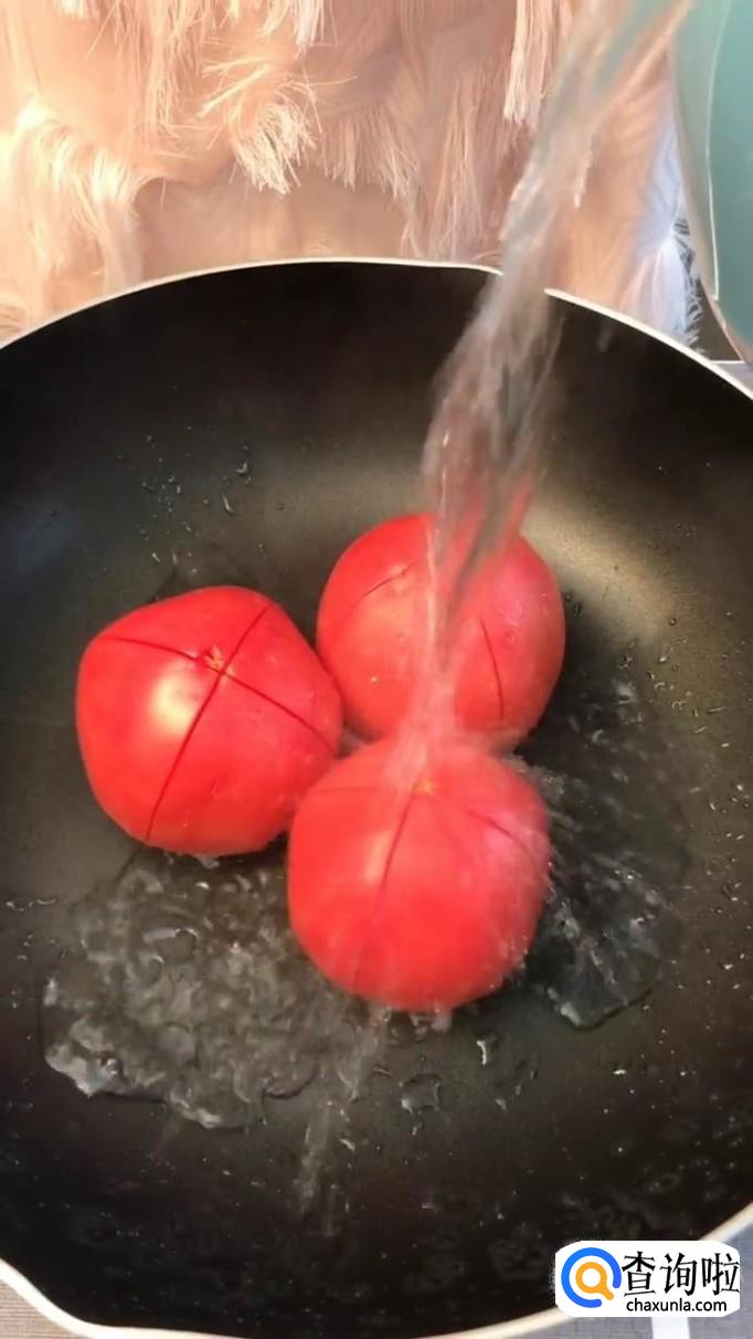 首先,将西红柿打上花刀放入锅中,加入适量的开水烫一下,然后把表皮剥去,如下图所示。