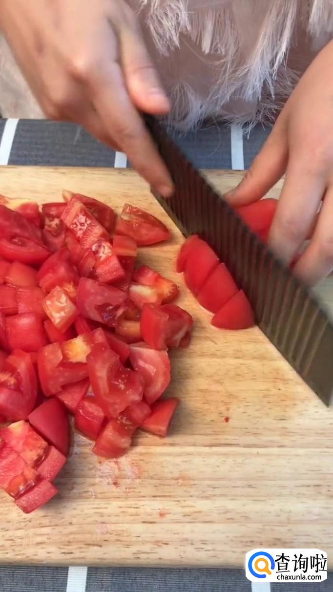 接着把切好的西红柿倒入锅中,翻炒五分钟。