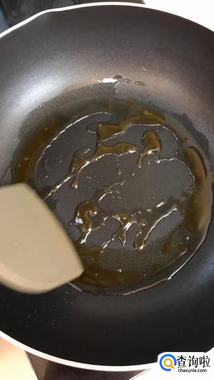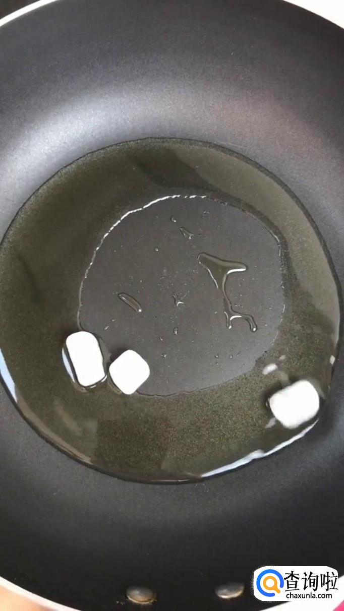 然后往锅中放入适量的食用油,待油冒烟,加入几块冰糖熬制金黄色,如下图所示。