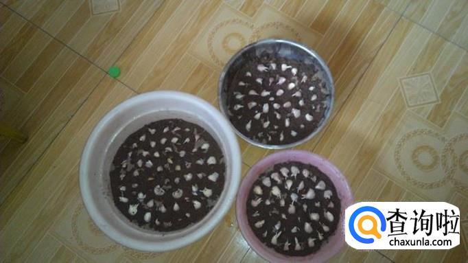 把蒜头一个个拿下来,再把有须的那头埋在泥土里面,不要太密也不要间距太宽。把整个花盆种满。