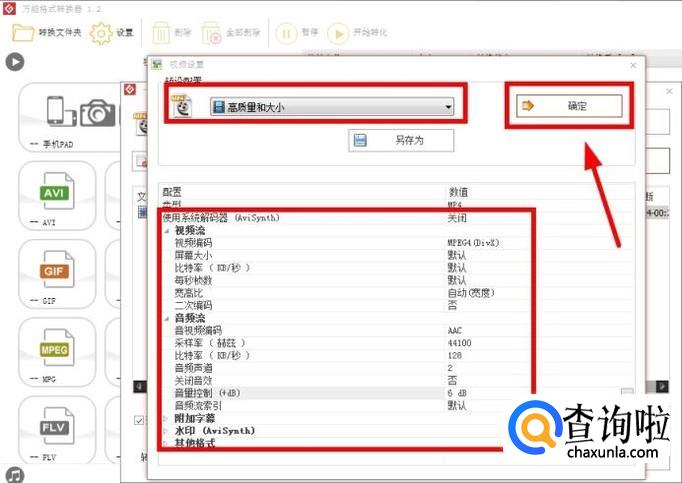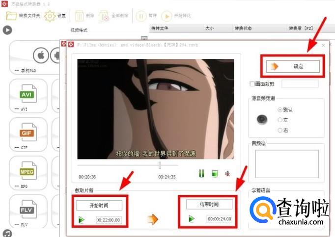 在“配置/数值”选项,设置好你截取视频的视频流/音频流/附加字幕/水印等选项参数,设置好参数后点击“确定”