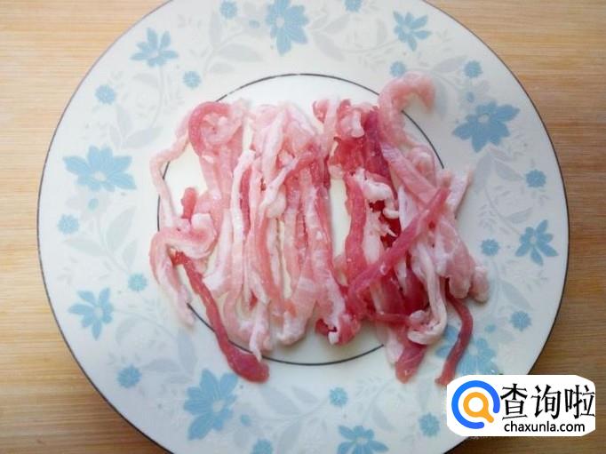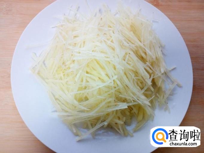 土豆去皮,用水清洗干净,控干水分,切成丝。放入水中浸泡,去除淀粉成分,然后用水投洗干净,控干水分。