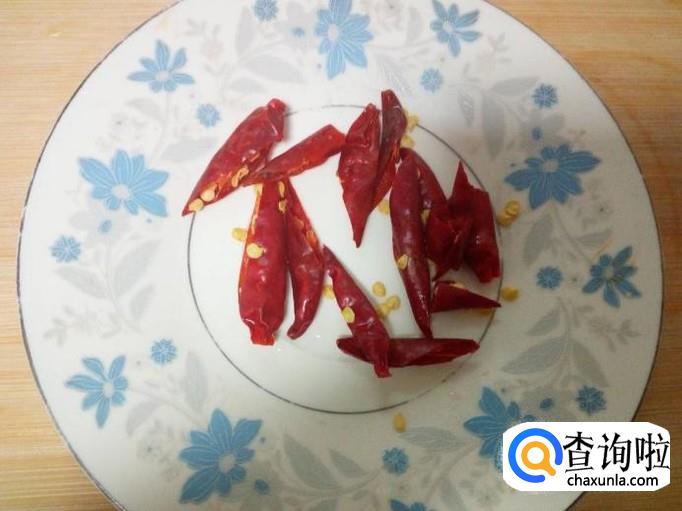 红干椒用水清洗干净,控干水分,斜刀切成段。
