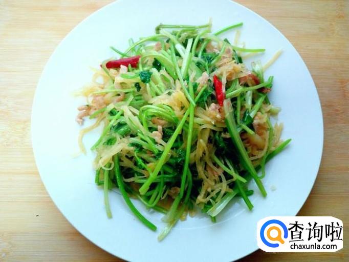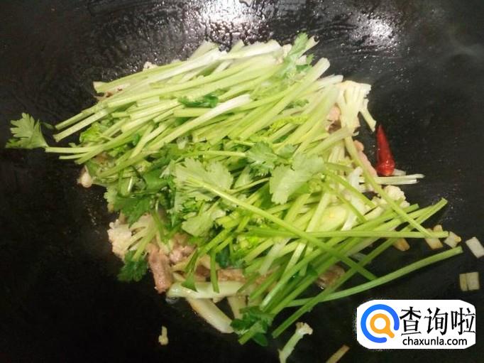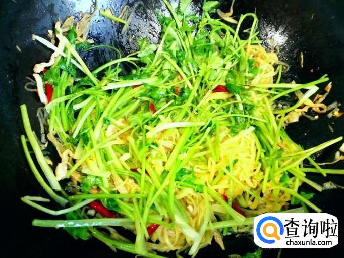 炒至土豆丝断生,放入香菜翻炒。炒至香菜变软,刚出亮光,立即关火,放入味精出勺。