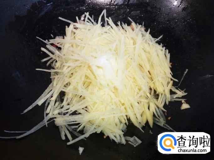 炒至肉颜色微白,放入葱,姜,蒜,红干椒翻炒,放入少许酱油。随即放入土豆丝翻炒,放入少许料酒,滴少许醋,放入盐。