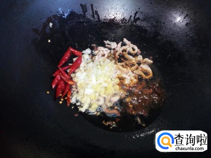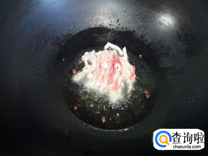 锅里放入油加热,油热后放入花椒爆锅,放入肉翻炒。
