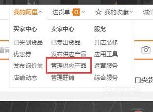 登录成功后,把鼠标停留在“我的阿里”按钮上,在弹出来的下拉窗口中,点击“管理供应产品”