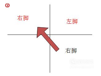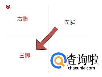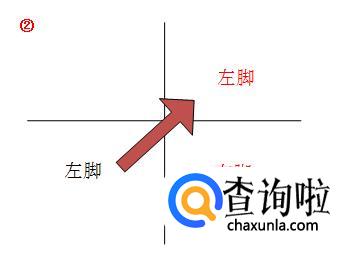 首先,我们伸出左脚,向右前方迈出。手部动作为自然摆动为右手高左手低。