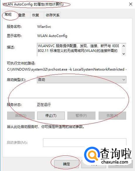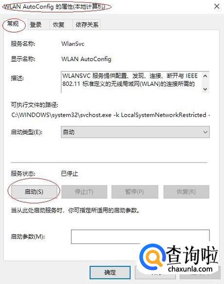 如图所示,弹出"WLAN AutoConfig的属性"对话框。选择"常规"标签,点击"启动"按钮。