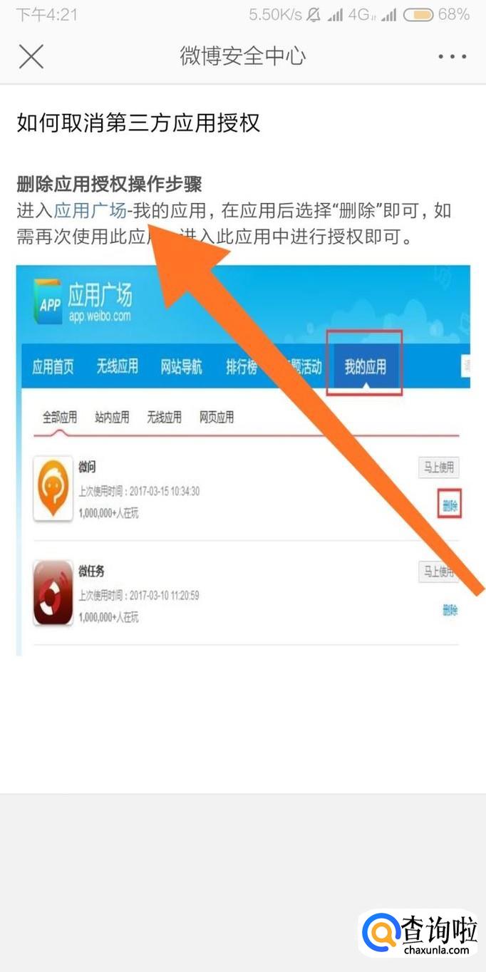 最后点击第三方应用下方的“删除”字样即可取消微博对第三方应用的授权。