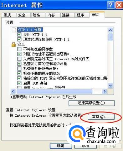 在“Internet属性”框中,点击“高级”按钮,然后在“高级”页面下,点击“重置”。