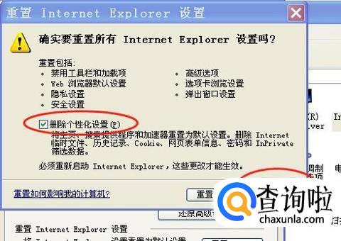 在弹出的“重置”框中,勾选“删除个性化设置”,接着点击“取消”按钮。