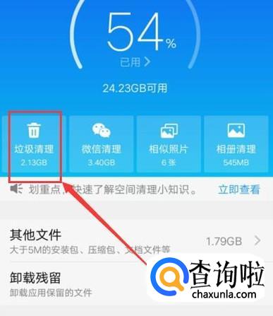 选择“垃圾清理”即刻释放手机内存,这样手机的空间就会增长,如图所示。