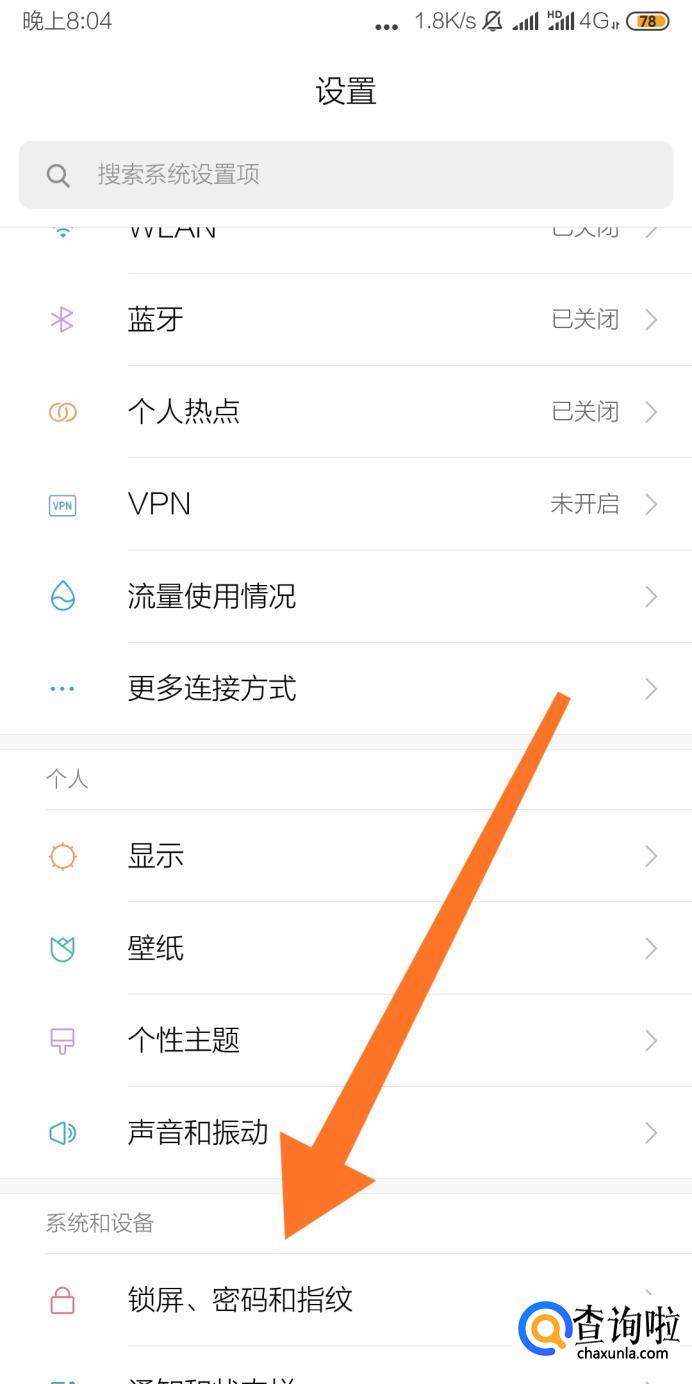 然后点击进入“锁屏、密码和指纹”设置选项。
