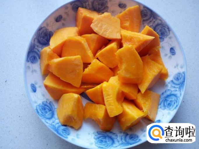 南瓜去皮,去瓜子,用水清洗干净,控干水分,切成块。