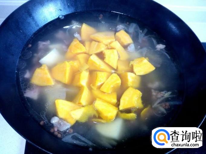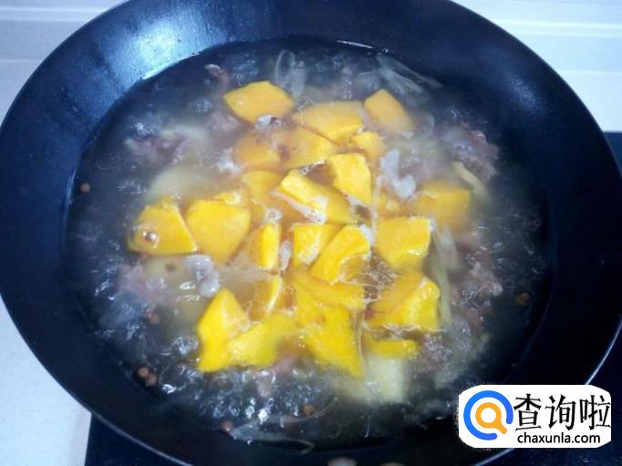 土豆炖十分钟左右的时间,放入南瓜转大火烧开,再转小火慢炖。