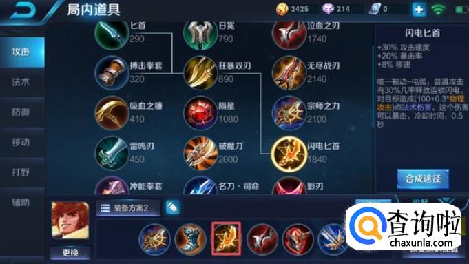 第三件装备我们可以出闪电匕首,这个装备可以提高裴擒虎的攻击速度以及暴击率,其次,还能提高移动速度,这样裴擒虎就可以更快的抓人了,基本上第三件装备出来之后,可以秒杀对方的射手了。