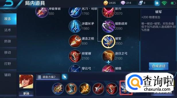 第六件装备我们可以出破军,这个装备可以加200的物理攻击,此时也到了对战的尾声了,出这个装备可以帮助裴擒虎更好的攻击对方的脆皮,基本上一套技能就可以杀掉对方的射手或者法师了。