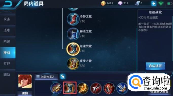 第二件装备我们可以出极速战靴,这个装备可以提高裴擒虎的攻击速度,因为第一件装备并没有加攻击速度这个属性,所以我们第二件装备是必须要出极速战靴的。