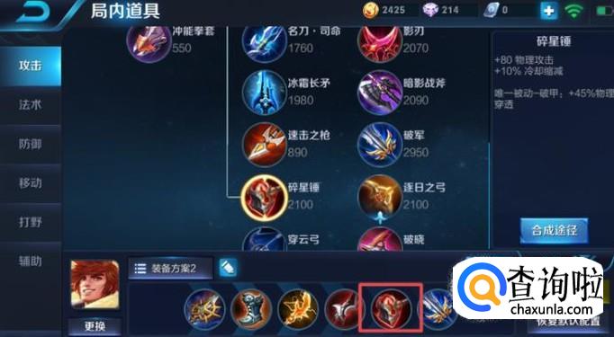第五件装备我们可以出碎星锤,这个装备可以提高冷却缩减,这样裴擒虎的技能恢复就可以更快了,也就有利于我们更快的利用技能进行抓人了。