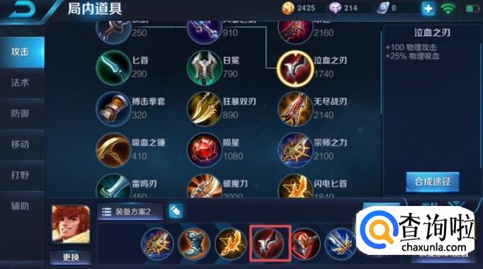 第四件装备我们可以出泣血之刃,这个装备的用处在于可以有25%的物理吸血,这个属性是非常有用的,这样我们就可以利用小兵和野怪进行回血了,而且打对方的时候,也可以帮助自己恢复血量。