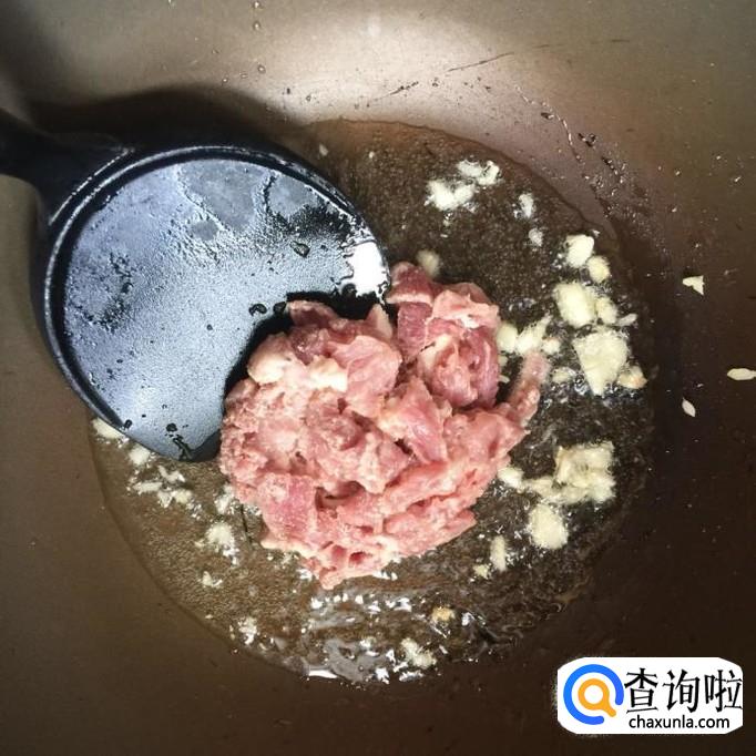 首先把蒜蓉倒入锅中爆香,如下图所示。