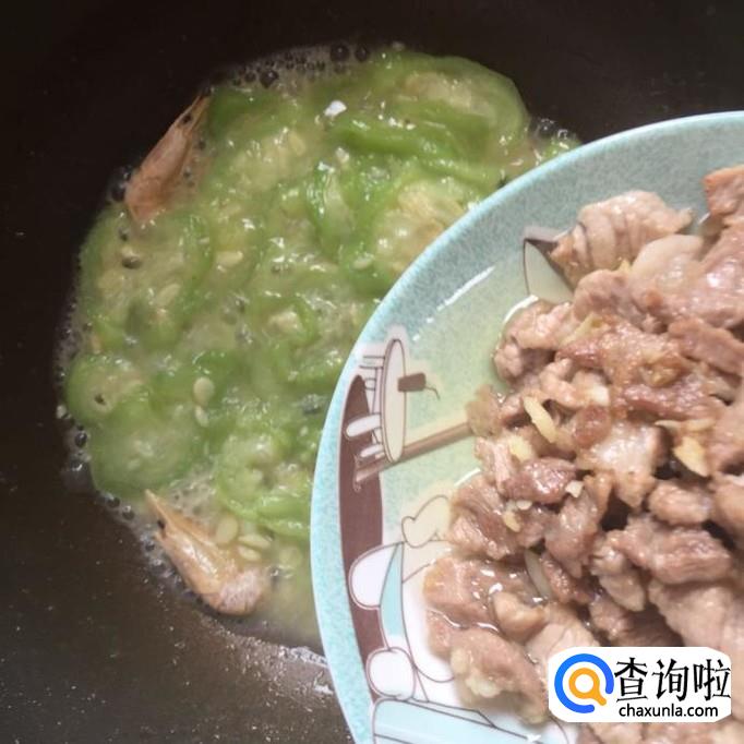 然后把炒好的瘦肉,倒入锅中翻炒一分钟。