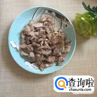 然后把瘦肉切成薄片并用适量的地瓜粉裹一下,倒入锅中翻炒五分钟起锅备用。