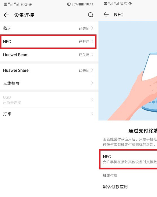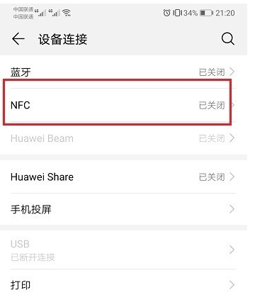 3、第三步在设备连接,点击NFC,功能打开即可: