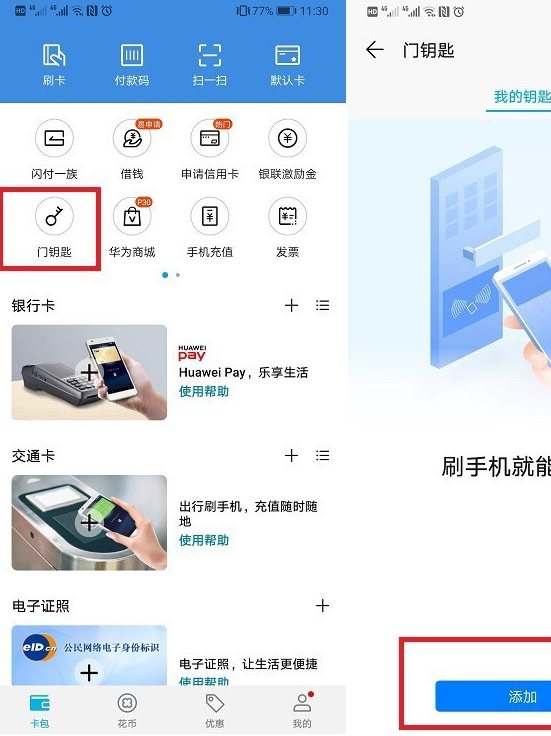 门钥匙是华为钱包为用户提供的一种可以用华为手机模拟实体门禁卡代刷的功能,该功通过开启NFC功能后即可实现。操作方法:打开华为手机【钱包】-【门钥匙】-进去按照步骤进行添加即可。