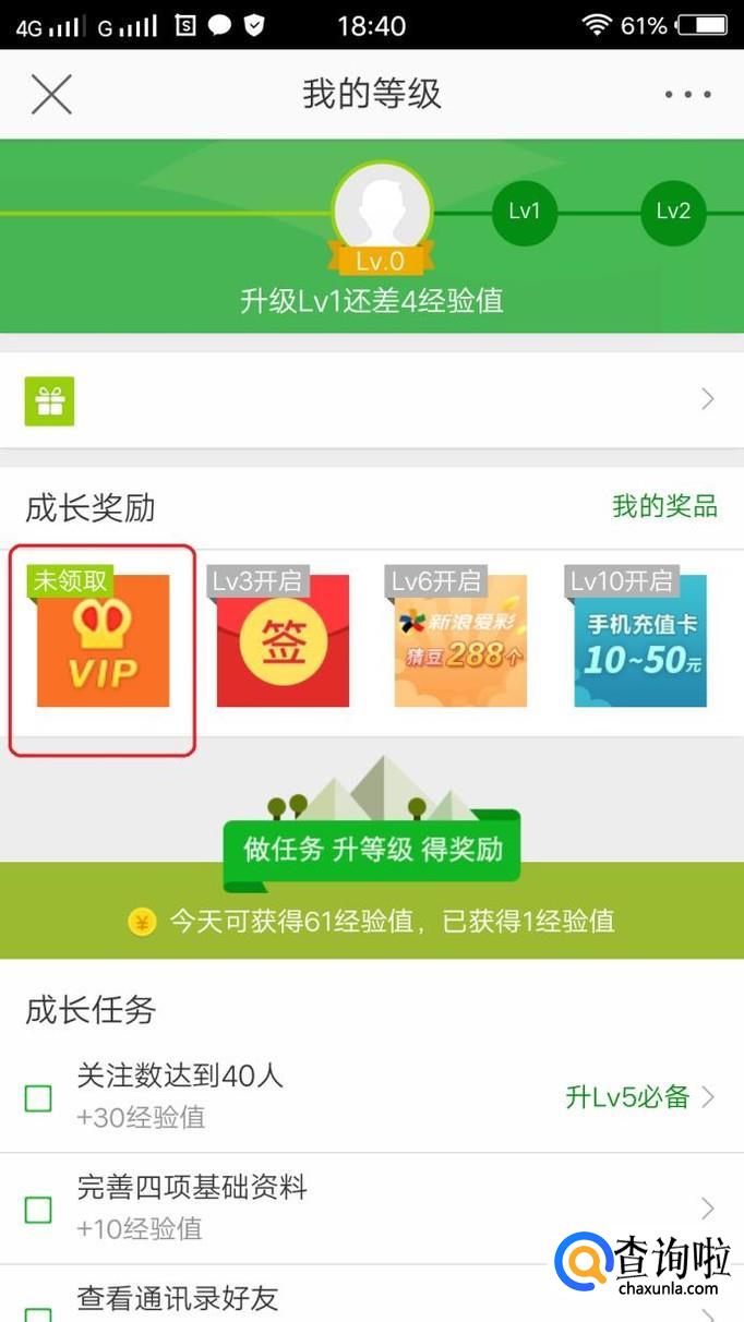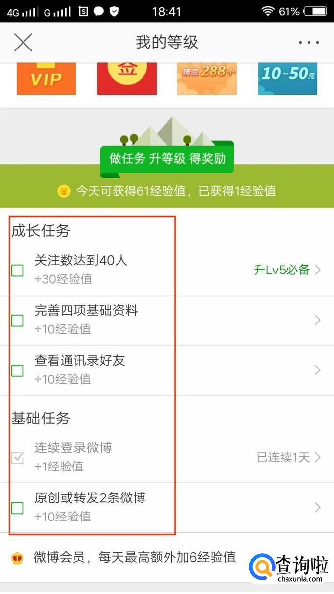 其次,在开通会员的时候有个小技巧,在新手任务界面中,我们看到成长奖励里面有如图所示的“VIP”未领取图标,点击一下,我们看到这是一个体验卡,并且是1~2级专享,所以我们可以先激活体验一下,觉得好用再开通会员不迟。微博会员能每天多获得一些经验,对快速升级有帮助。