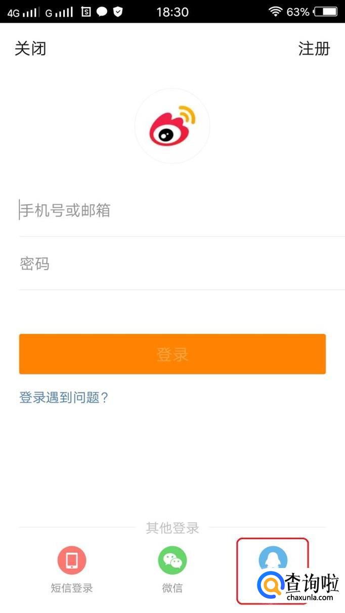 首先,下载安装微博,安装完成以后会进入如图所示的登录界面,我们点击一下QQ的Logo。